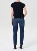 Agolde's Cocktail Ankle Jean is a slim, ankle-length pant in dark red cast indigo denim. Crafted from comfort-stretch regenerative cotton with a super-soft hand, it offers a sleek, true-to-size silhouette. Fading, marbling, and whiskering details add subtle character, making it perfect for pairing with fitted tops or layering under oversized knits for a modern, versatile look.