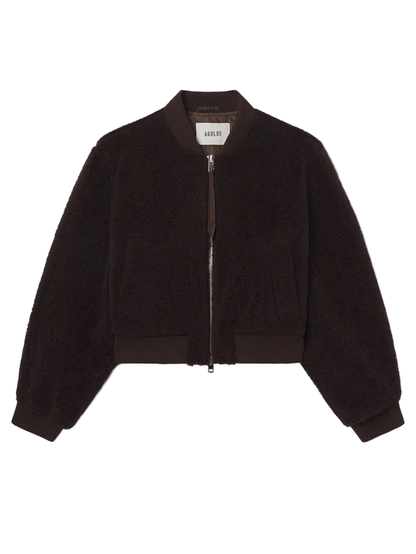 The Iona Skye Jacket from AGOLDE is a modern take on the bomber, cut in a cropped silhouette with voluminous sleeves and a zip-front closure. Crafted from ultra-soft sherpa in a rich chocolate brown, it’s equal parts cozy and refined. Layer over denim or tonal separates for a cool, textured finish. This fit is true to size.