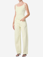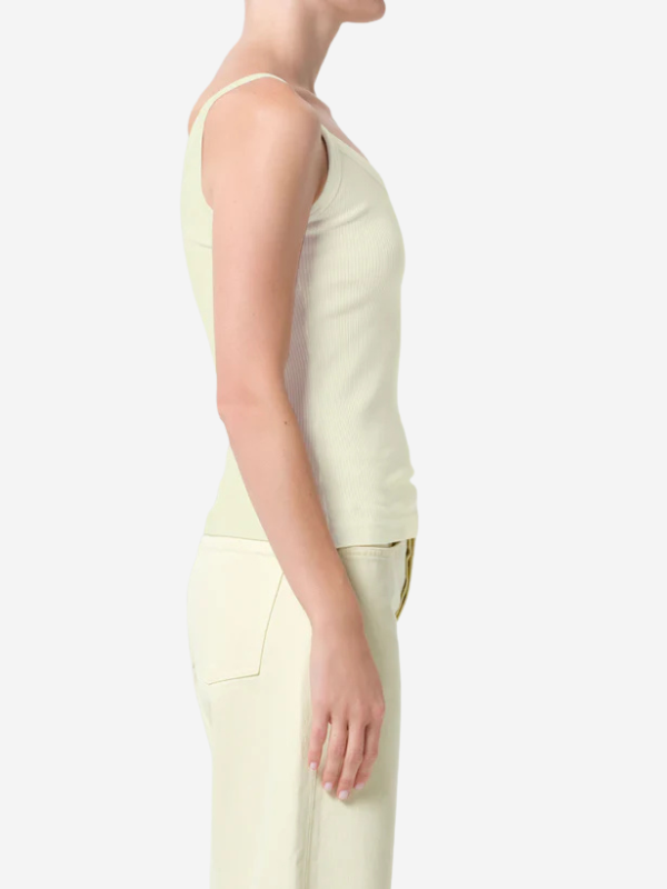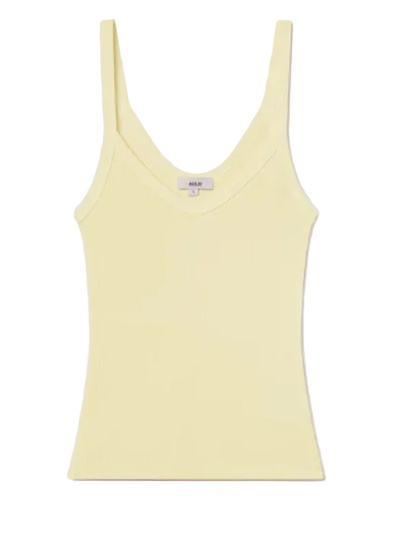 Agolde Jordan Tank in Lemon Drop worn with light denim pants, showing the sleeveless V-neck ribbed silhouette.