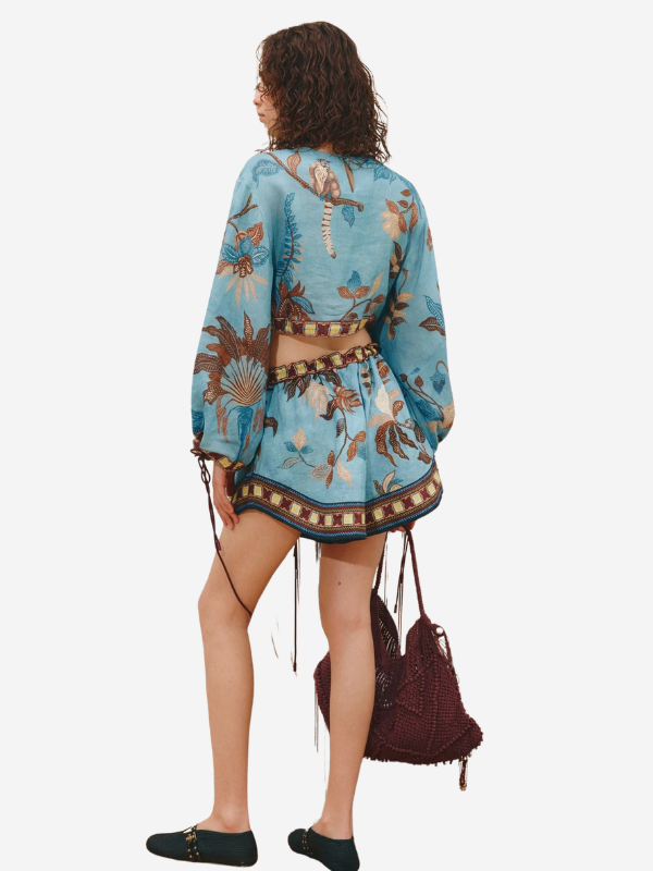 Back view of the model in the Georgie Short in Multi by Alemais, highlighting the shorts' floral details and relaxed style with a lacy bag.