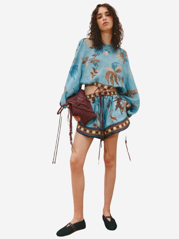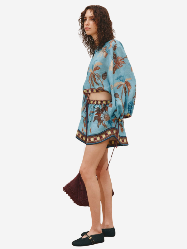 Side view of the Georgie Short in Multi by Alemais on a model, featuring drawstrings and a floral design, paired with a casual top.