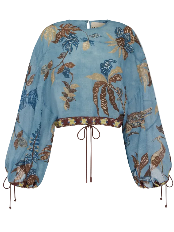 The Georgie top by Alémais is a cropped long-sleeve silhouette, round neck with button loop closure at the back of the neck. This top features drop shoulders, bespoke toggles at the cuff and a drawstring hem for comfort.