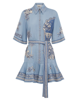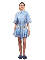 The Villa Romantica dress by Alémais is a mini silhouette with a pointed collar. This dress also features embroidered motif detail with raffia buttons and in-seam pockets.