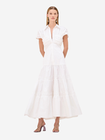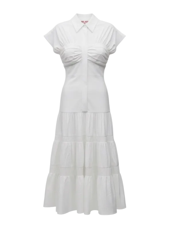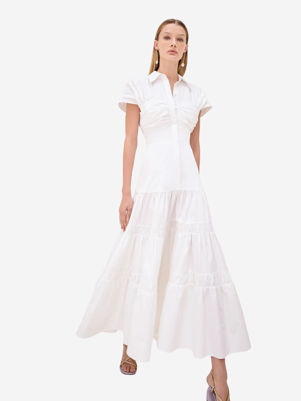 Close-up of the Carosini Dress in White by Alexis showcasing the tiered midi silhouette and shirring detail.