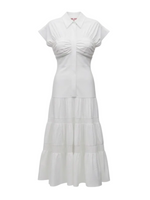 The Carosini Dress by Alexis is a short sleeve tiered midi dress with shirring along the bust and a structured shirt collar.