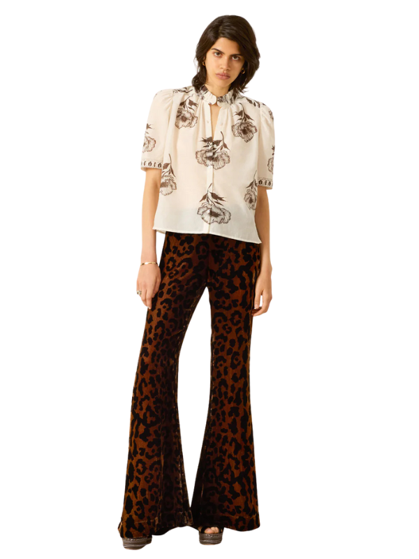 The Winn obsidian poppy shirt by Alix of Bohemia  has puff shoulders and a feminine ruffled collar. This is a cotton-silk blend shirt featuring a hand-block-printed with a detailed poppy motif. Subtle printing and dye variations are part of the unique beauty of the garment and a signature of the artisan's hand.