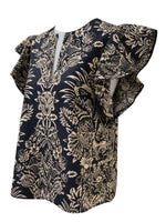 Close-up of the Severine Flutter Sleeve Top in Noir Flora by Ulla Johnson showing the detailed batik texture and loose fit.