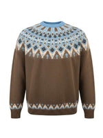 Staud's Zane Sweater is a Fair Isle style sweater in chocolate brown and blue.
