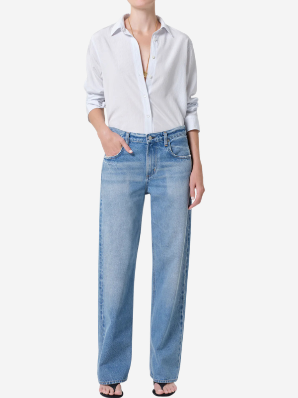 Citizens of Humanity Avni Slim Shirt in Blue Micro Stripe — model wearing the slim-fit blue micro stripe button-up with jeans