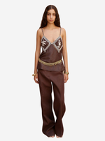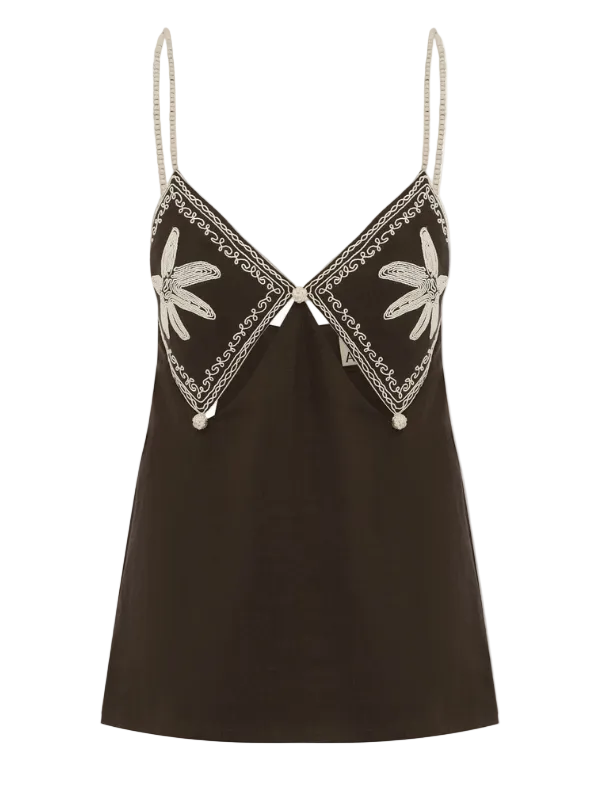 The Leandra corded cami top by Alémais features artwork from Laurence Leenart. This is a relaxed silhouette, with diamond cut paneling and a button loop closure at the center back for comfort.