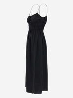 Model wearing the Marianne Dress in Black, styled with a simple sandal, ideal for vacation-inspired looks.