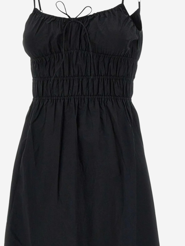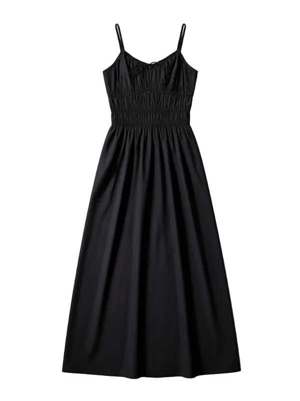 Close-up of the tie bow detail on the Marianne Dress in Black, highlighting the feminine gathering at the bust.