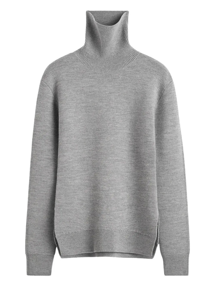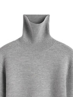 High-neck Double Knit Sweater in Pale Grey Melange displayed on a mannequin with a ribbed edge detail.