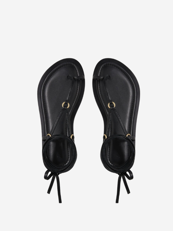 Close-up view of the A.Emery Tesni Sandal in Black featuring thin straps and circular metal rings.