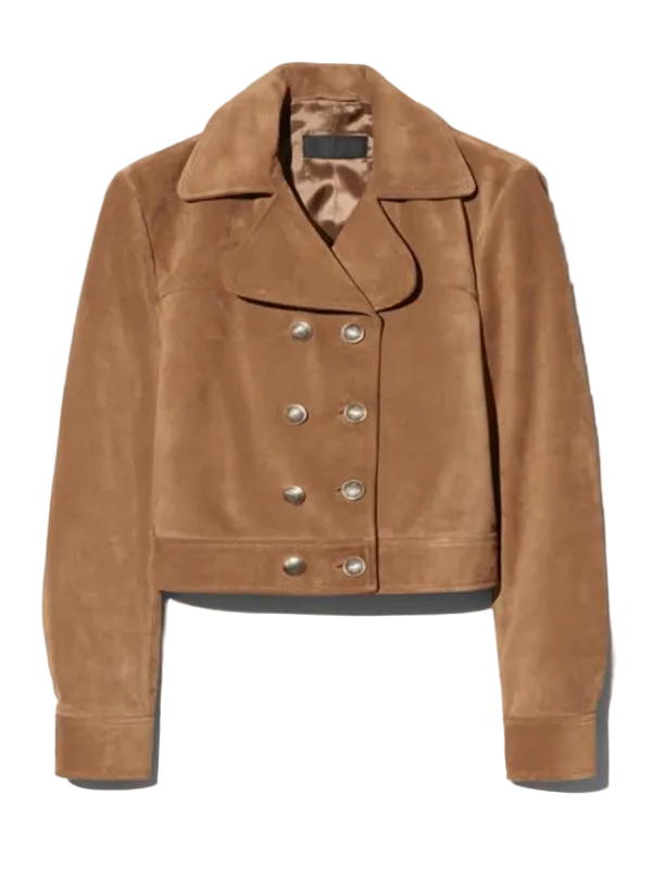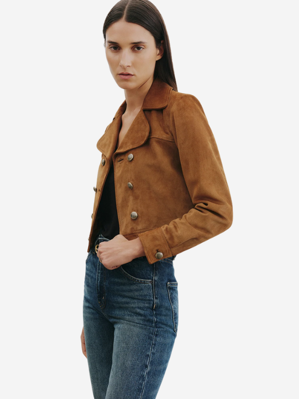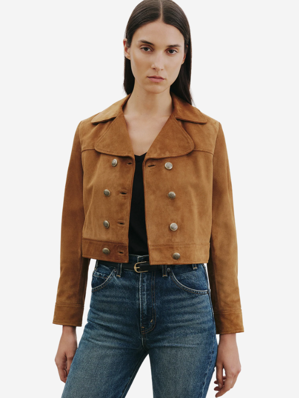 Nili Lotan's Cassidy is a shrunken double-breasted jacket in Italian suede. Antique brass crest buttons at center front and cuffs. Exaggerated lapel. Seaming detail at front and back with topstitching. Fully lined.