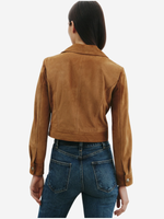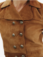 Close-up of the Cassidy Suede Jacket in Martora, showing the rich Italian suede texture and exaggerated lapel details.