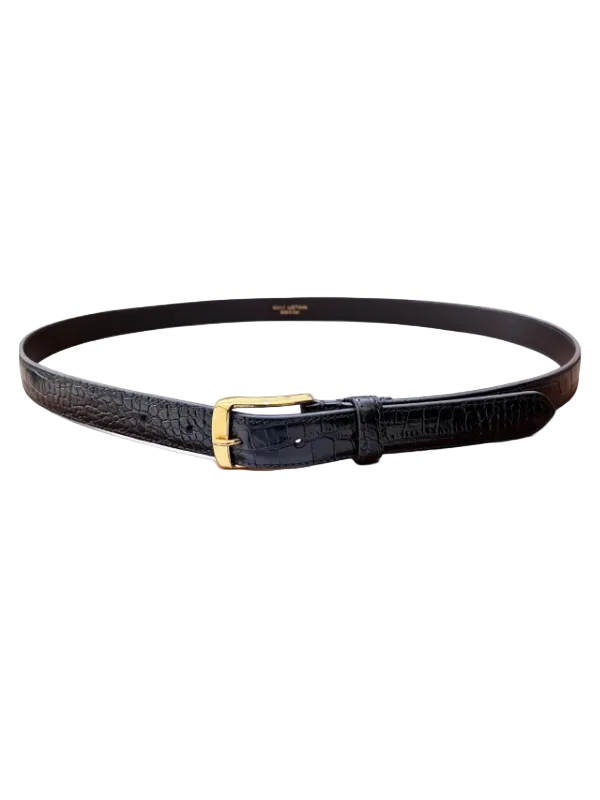 Nili Lotan's Dana is an embossed croc belt in Italian leather. Custom gold hardware finish. Italian hardware with engraved logo on the back. Lined in black contrasting leather. 25mm wide.