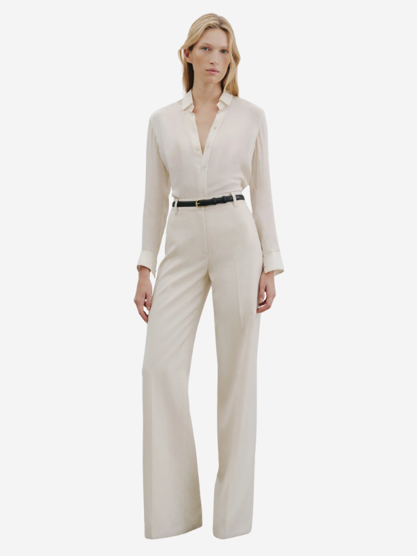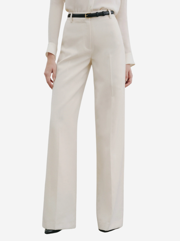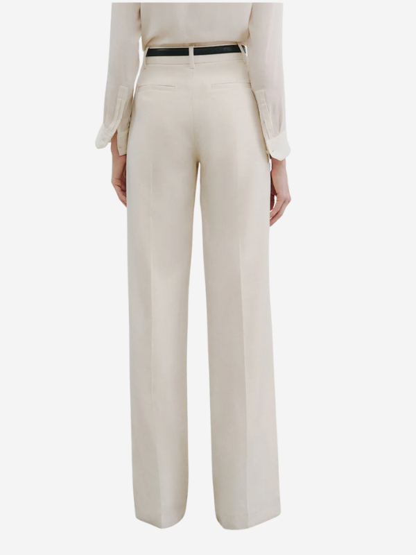 A flat lay of the Rivers Wool Pant in Stone by Nili Lotan, emphasizing its virgin wool composition and neutral color.