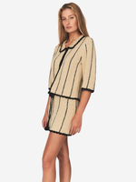 Model wearing the April Polo in Tan/Black paired with the April Mini Skirt for a trendy outfit.