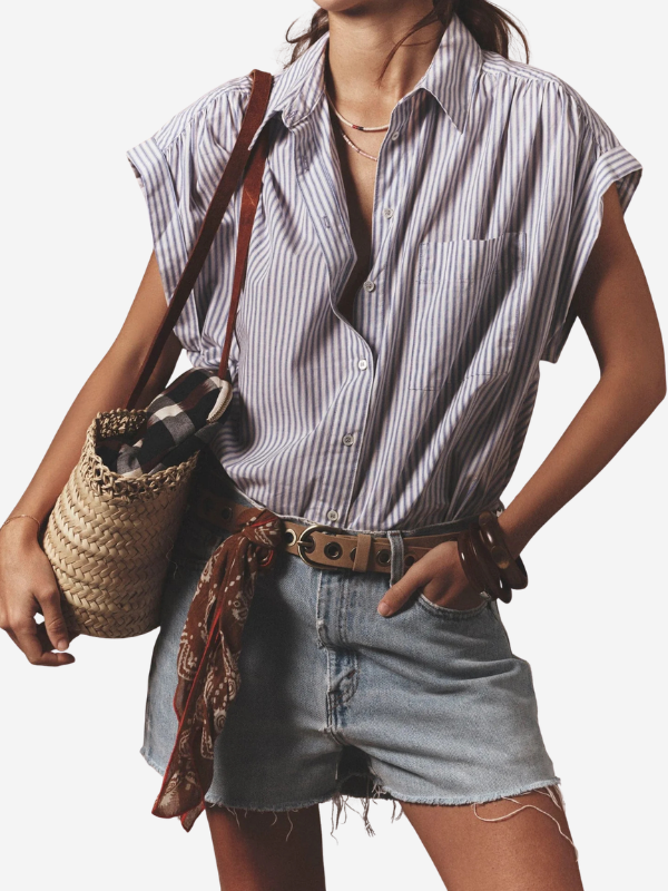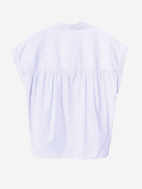 Lexi is new this season in Xirena's lightweight cotton stripe. This easy button-front shirt features a left chest pocket, cap sleeves, and softly shirred shoulders and back yoke finished with a button-tab detail.