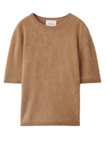 Model wearing the Maren Sweater in Toffee, featuring a crew neck and short sleeves for a casual look.