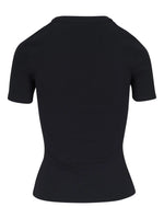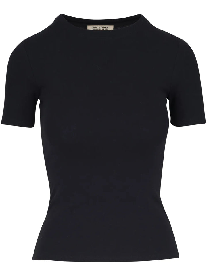 Close-up of the Elin Tee in Jet Black by Nili Lotan, highlighting the self trim at neck and cover stitch at sleeve.