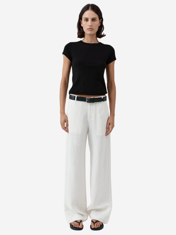 The Fine Band Carter Trouser  by St. Agni features a mid-rise waist, straight leg and fine waistband. Boasting a sleek appearance and elevated hand feel, the Fine Band Carter Trouser pair effortlessly with the 90s Linen Blazer for a streamlined ensemble.