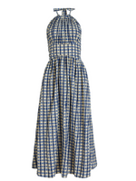 The Halter in the Name of Love Dress by Rosie Assoulin is a playful twist on a summer classic, cut in a blue-and-white gingham that feels both nostalgic and fresh. Its halter neckline ties neatly at the back, while a gathered bust and knotted front create a flattering shape with subtle cutout detailing. The full skirt falls softly from the cinched waist, adding ease and movement to the silhouette in lightweight and airy seersucker.