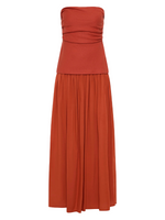Side view of the Hedy Maxi Dress in Dusty Tomato, highlighting the drop waist and A-line soft skirt.