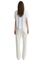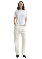 Close-up of the Twisted Seam Full Length Jean in Off-white, highlighting the directional side seams and organic cotton texture.