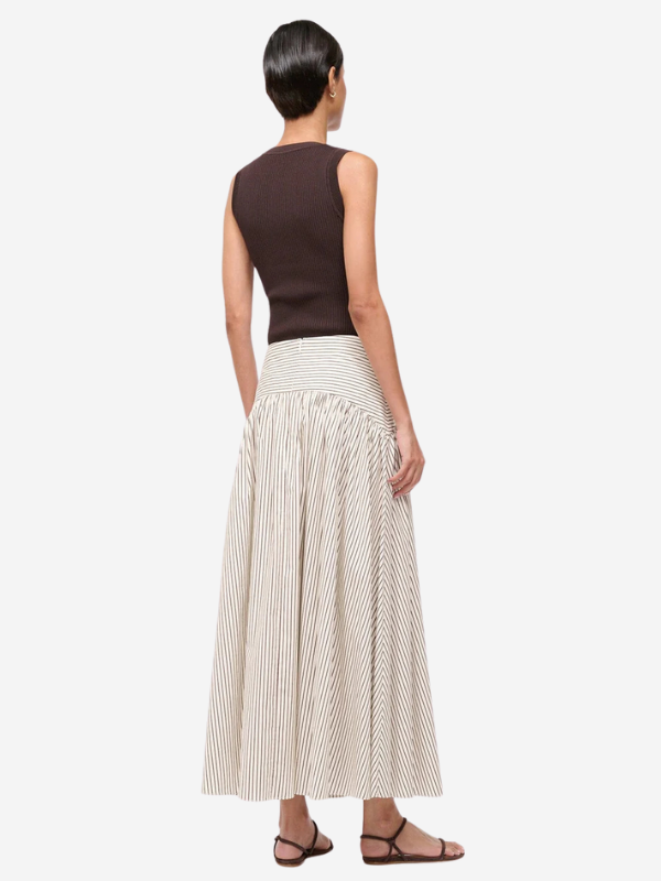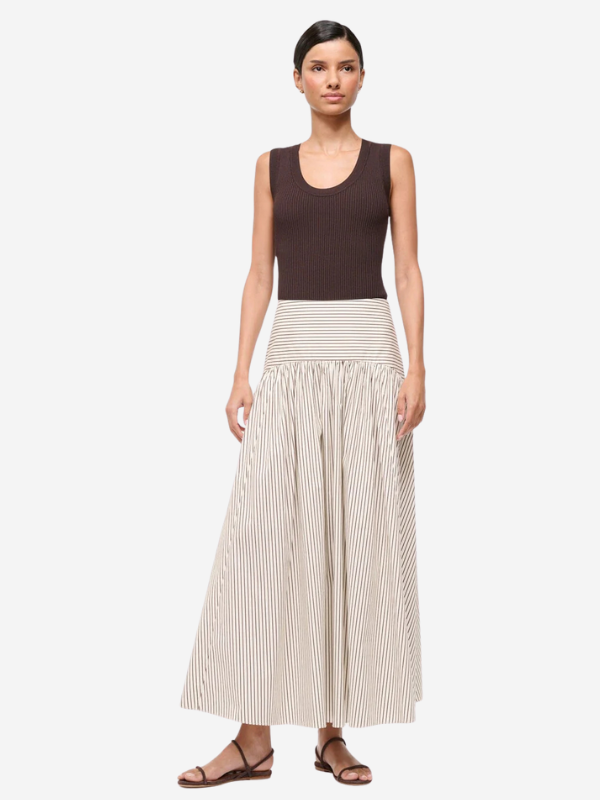 Model wearing the Procida Skirt in Ivory/Dark Oak Micro Stripe by Staud paired with a fitted brown top, highlighting the skirt's flowy silhouette.