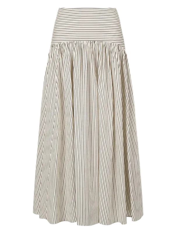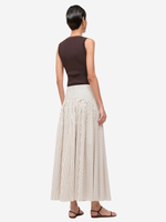 Back view of a model in the Procida Skirt in Ivory/Dark Oak Micro Stripe by Staud, featuring a gathered waist and flowing fabric.