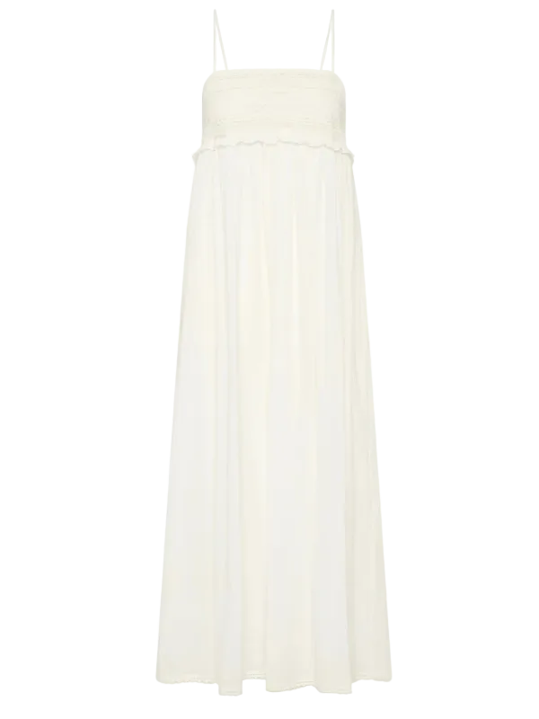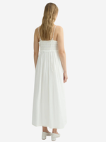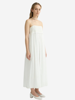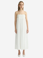 Model wearing the Danielle Dress in Vintage White by Posse, featuring a softly gathered skirt and adjustable straps for a personalized fit.