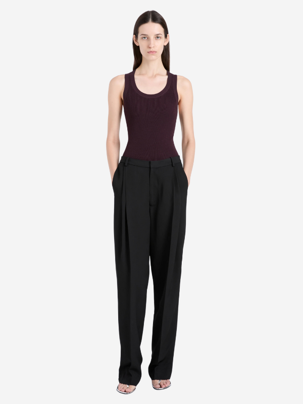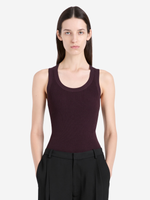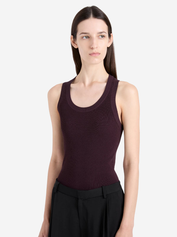 Close-up of Roberts Knit Tank in Aubergine, highlighting the soft matte viscose and rib-knit details.