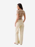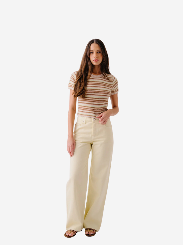 The Jude Cashmere Tee in Buttercup laid flat to reveal the luxurious 100% cashmere composition and multicolor stripe.