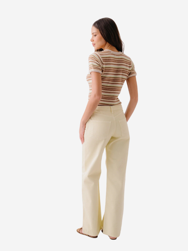 Close-up of Jude Cashmere Tee in Buttercup featuring soft cashmere fabric and vibrant stripe details.
