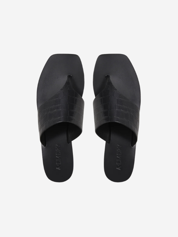 Showcasing the Paton Sandal in Black Croc by A.Emery, highlighting its leather upper and signature slim footbed.