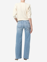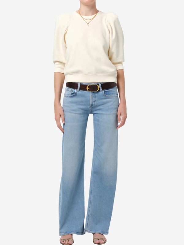 Model wearing the Nora Trouser in Bowery by Citizens of Humanity, paired with a cream puff-sleeved top, highlighting the stylish and comfortable fit.