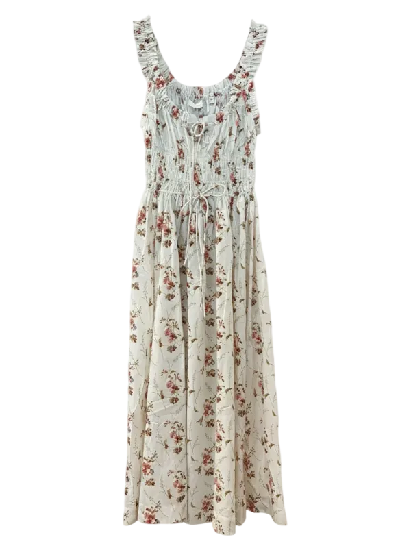 The Emmaretta dress by DÔEN features a shirred scoop neckline with self-tie closures and a petite ruffle trim. The bodice is smocked for subtle texture, extending into a full skirt.