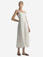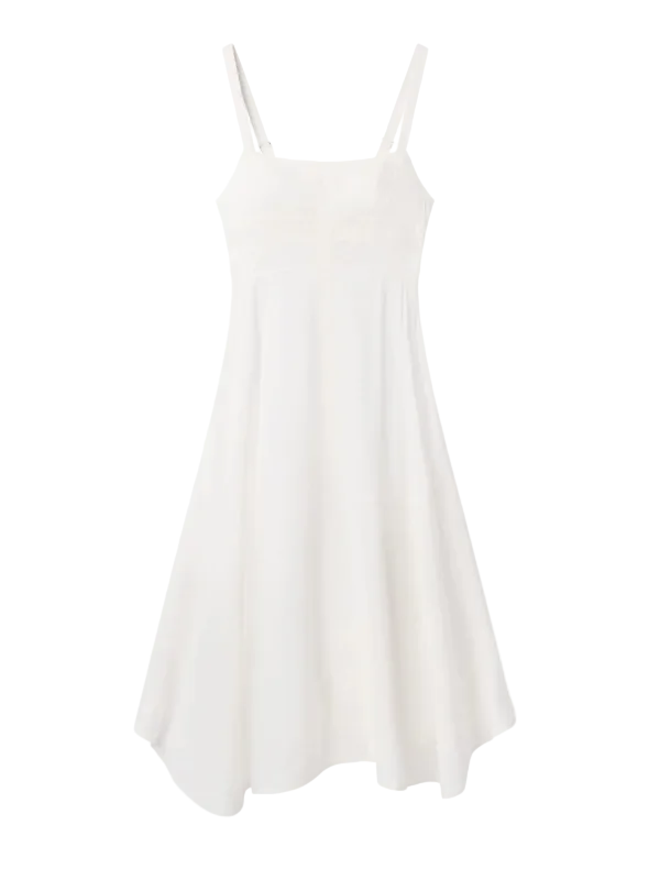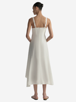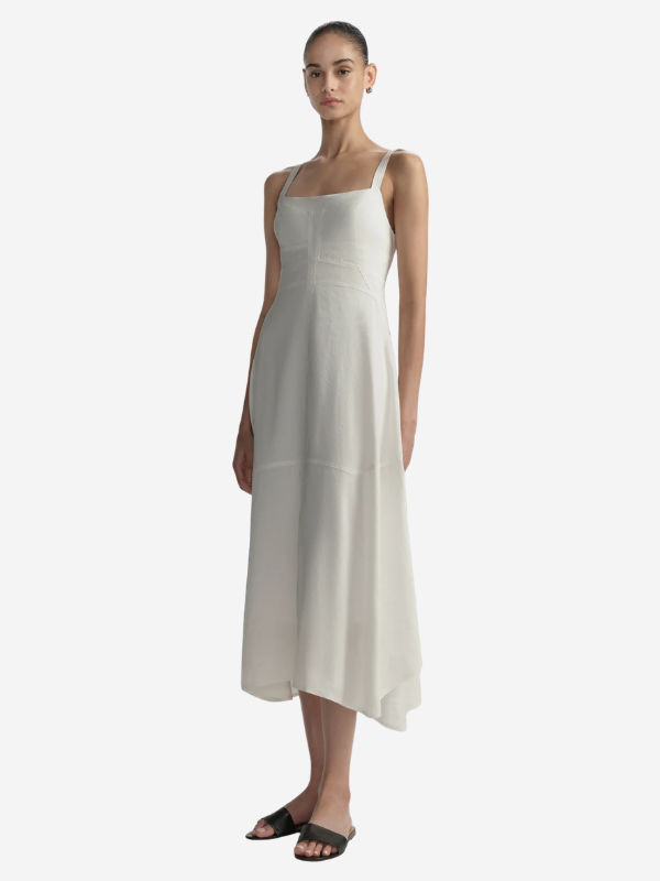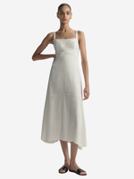 The Harlow Dress by A.L.C. is crafted from linen stretch poplin with a structured yet breathable feel and soft drape in a soft pearl hue. This midi silhouette features a square neckline, adjustable straps, and a smocked back panel, while seaming through the bodice enhances the shape and is finished with an asymmetric hemline.