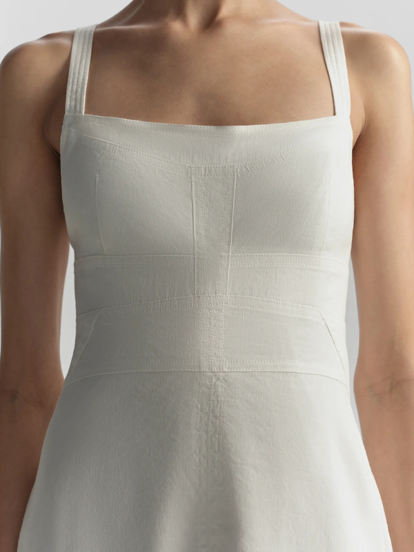 A.L.C. Harlow Dress in Pearl — close-up of the square neckline and structured bodice seaming