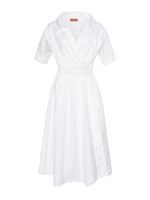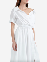 Side angle of Lydia Dress in Optic White, emphasizing its relaxed midi length and stylish silhouette.
