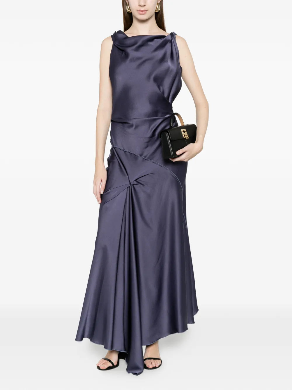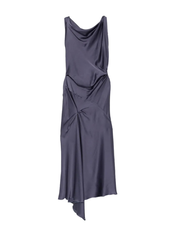 Full view of the Posy Midi Dress in Eclipse by Victoria Beckham with V-shaped back.