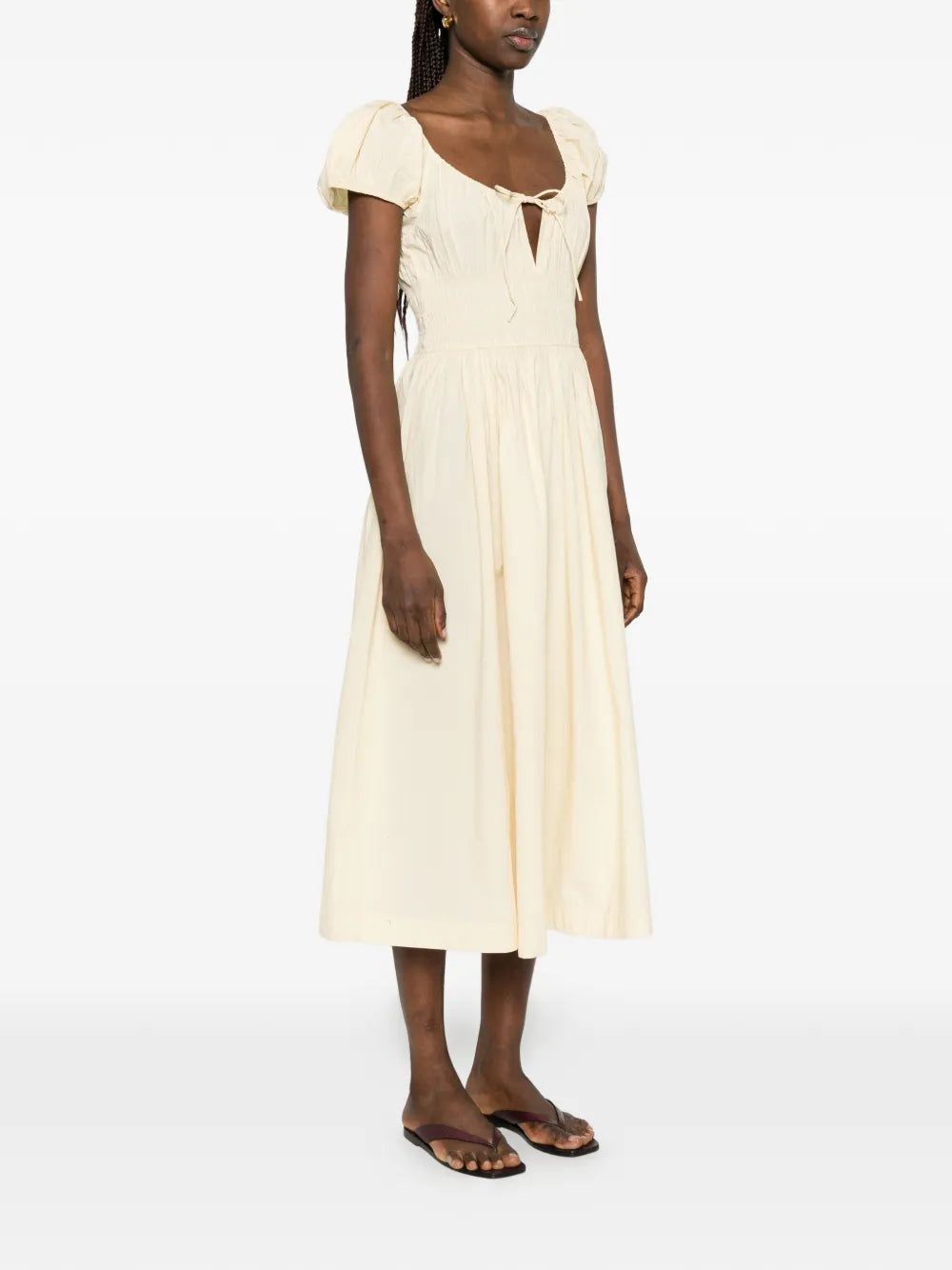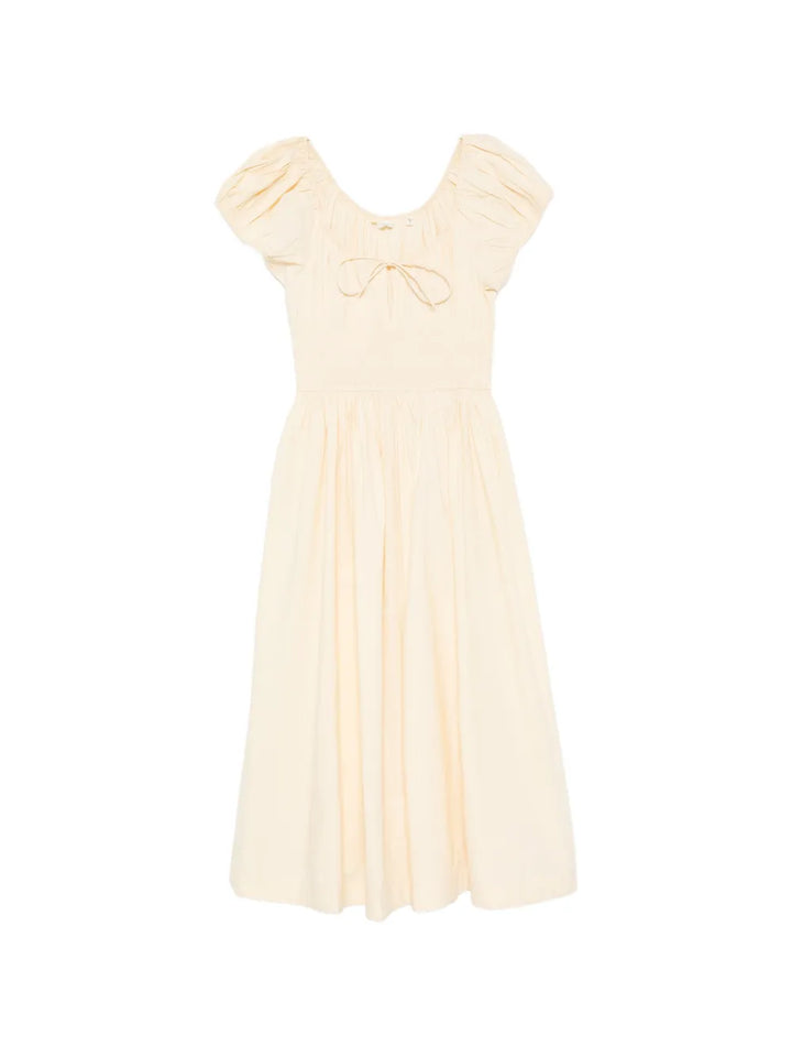 Dôen's Quinn Dress in Buttercream highlighting the short puffed sleeves and fitted bodice.