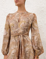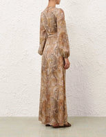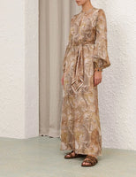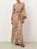 The Rebellion Sheath Dress from Zimmermann's Cruise 2026 Collection, Twisted Romance. A silk maxi dress featuring a crew neckline, keyhole detailing at the bust and long billow sleeves with elasticated cuffs.