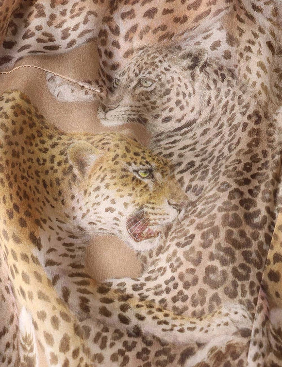 Back view of Rebellion Sheath Dress in Latte Leopard highlighting the unique design and luxurious silk fabric.