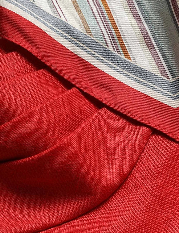 Composition: Red main: 100% linen; fusing: 100% polyester; belt: 100% silk