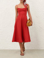 The Rebellion Tuck Midi Dress from Zimmermann's Cruise 2026 Collection, Twisted Romance. A linen midi dress featuring drape detailing across the bust, adjustable straps, finished with a full flare skirt.