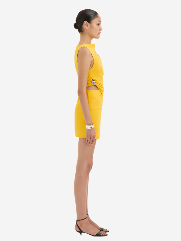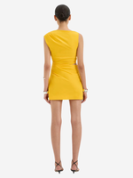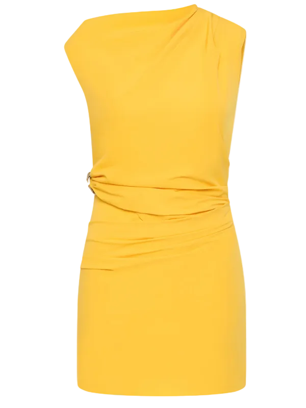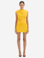 The Sol Mini Dress by SIR. is an event dress crafted from form-fitting stretch nylon. It features an asymmetric neckline, soft tucks through the body, and a SIR. custom hardware detail at the waist.
