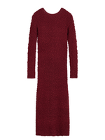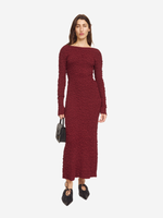 Close-up view of the Venus Dress in Cabernet by By Malene Birger, emphasizing the luxurious fabric and elongated sleeves.
